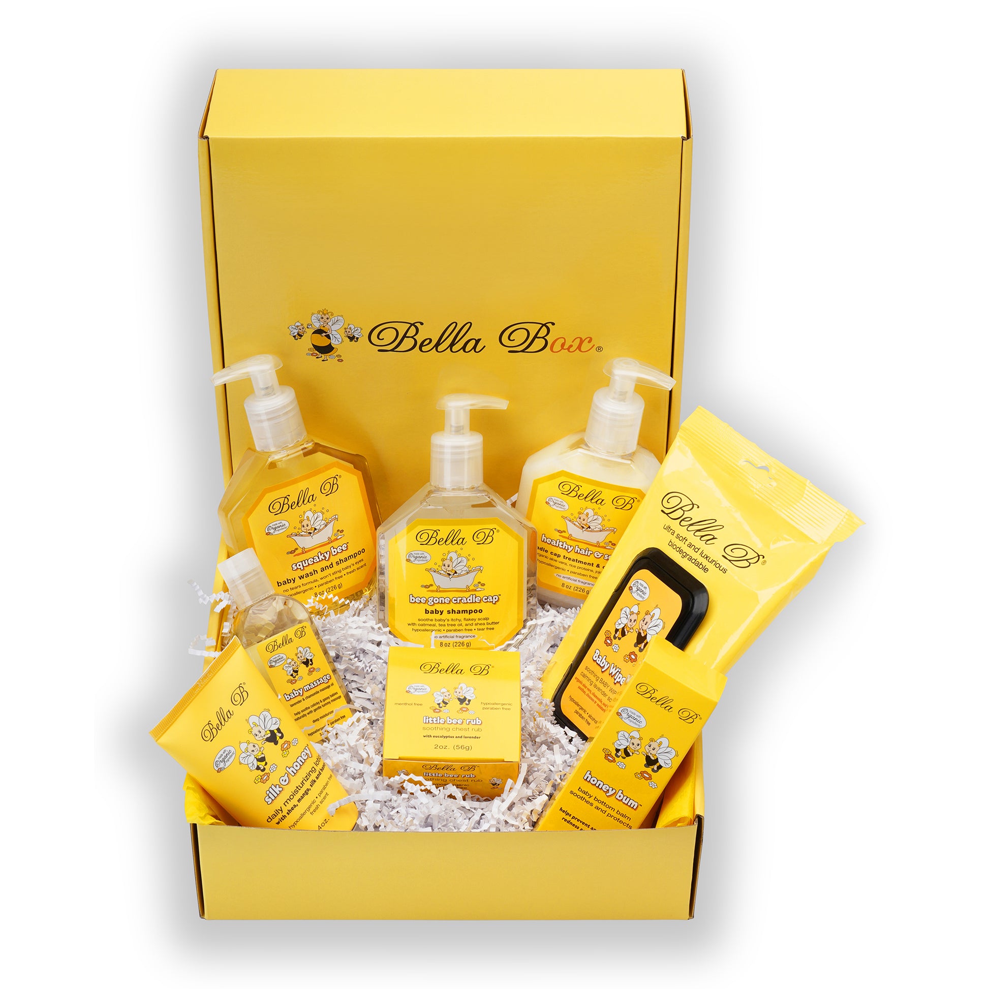 The Bella B Bella B Baby Essentials Set contains 8 full size products. Everything a new mom needs for baby skincare, haircare, diapering and more. Set includes 1 each: Squeaky Bee 8 oz (Hair/Bodywash) Bee Gone Cradle Cap Shampoo 8 oz Healthy Hair & Scalp 8 oz Silk & Honey Lotion 4 oz Honey Bum 2 oz(Diapering Cream) Little Bee Rub 2 oz (Decongesting Chest Rub) Baby Massage Oil 3.3 oz Baby Wipes 50 ct Makes a wonderful gift for a baby shower, hospital care package or first birthday. All products are free of parabens, mineral oil and lanolin. No Animal Testing. All products are Hypoallergenic. Made with natural and organic ingredients.