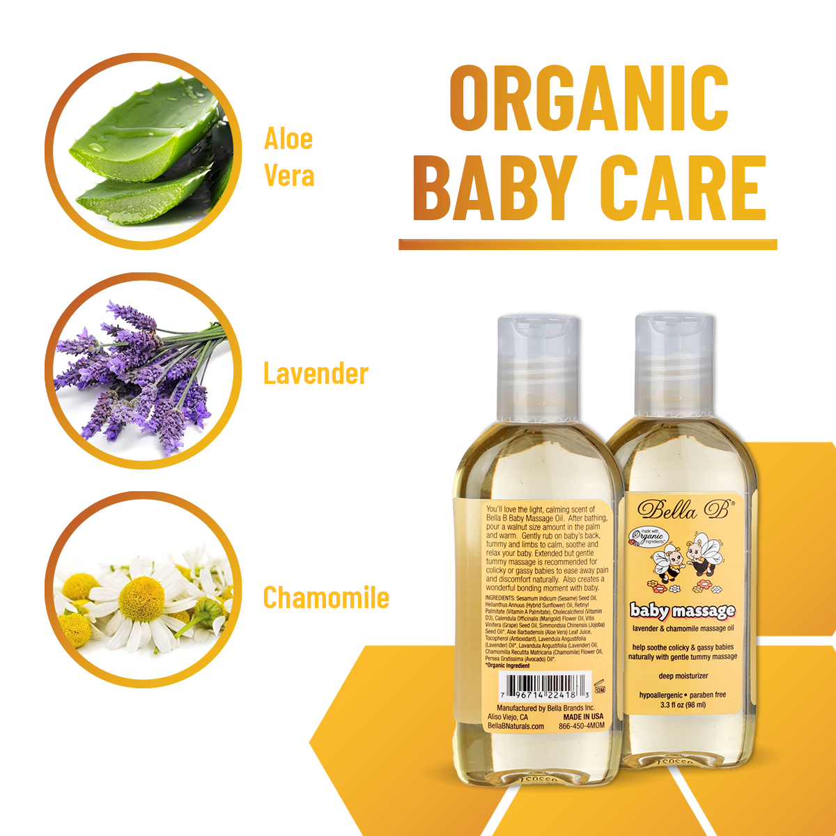 You'll love the light, calming scent of Bella B Baby Massage Oil with lavender and chamomile. After bathing, pour a walnut size amount in the palm and warm. Gently rub on baby's back, tummy and limbs to calm, soothe and relax your baby. Extended but gentle tummy massage is recommended for colicky or gassy babies to ease away pain and discomfort naturally. Also create a wonderful bonding moment with baby.