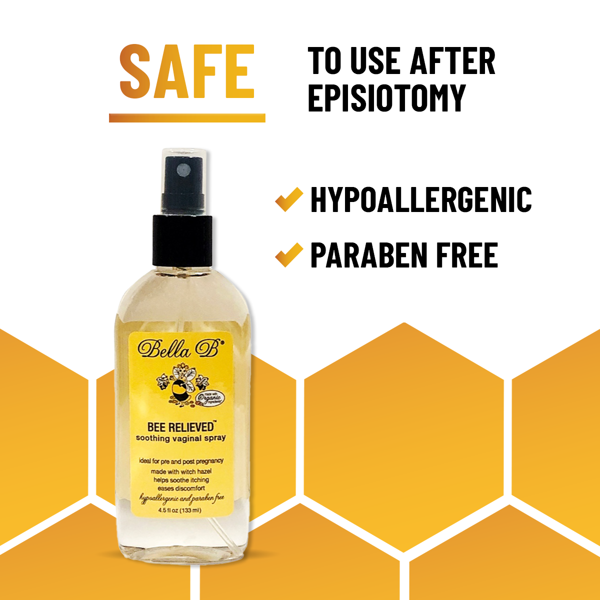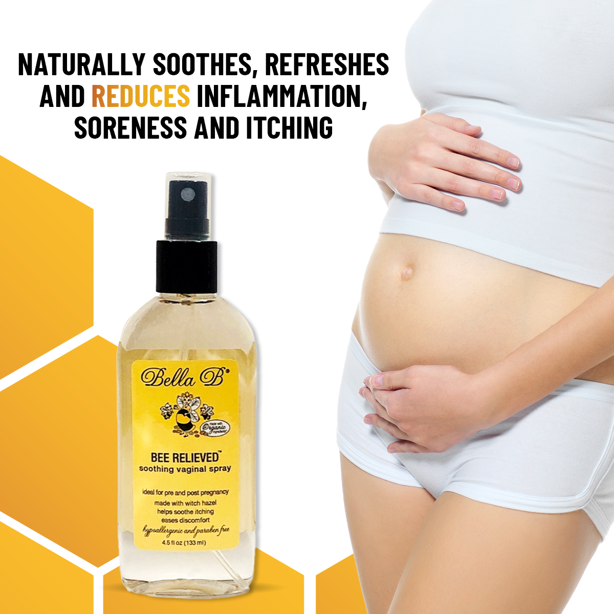 Bee Relieved Soothing Vaginal Spray is a convenient alternative to wipes to help soothe sensitive personal areas after giving birth or anytime irritation occurs. Fortified with soothing witch hazel and several key organic ingredients such as olive oil, cucumber, and honey, Bee Relieved helps reduce swelling and itching and leave skin soft, fresh and moisturized. Very pleasant light citrus scent and no artificial fragrance. Free of parabens (artificial preservatives). Use twice daily or as needed to soothe affected areas.
