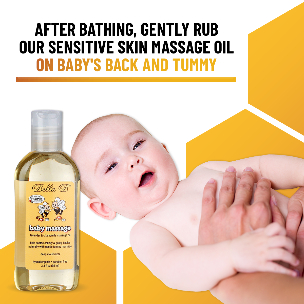 You'll love the light, calming scent of Bella B Baby Massage Oil with lavender and chamomile. After bathing, pour a walnut size amount in the palm and warm. Gently rub on baby's back, tummy and limbs to calm, soothe and relax your baby. Extended but gentle tummy massage is recommended for colicky or gassy babies to ease away pain and discomfort naturally. Also create a wonderful bonding moment with baby.