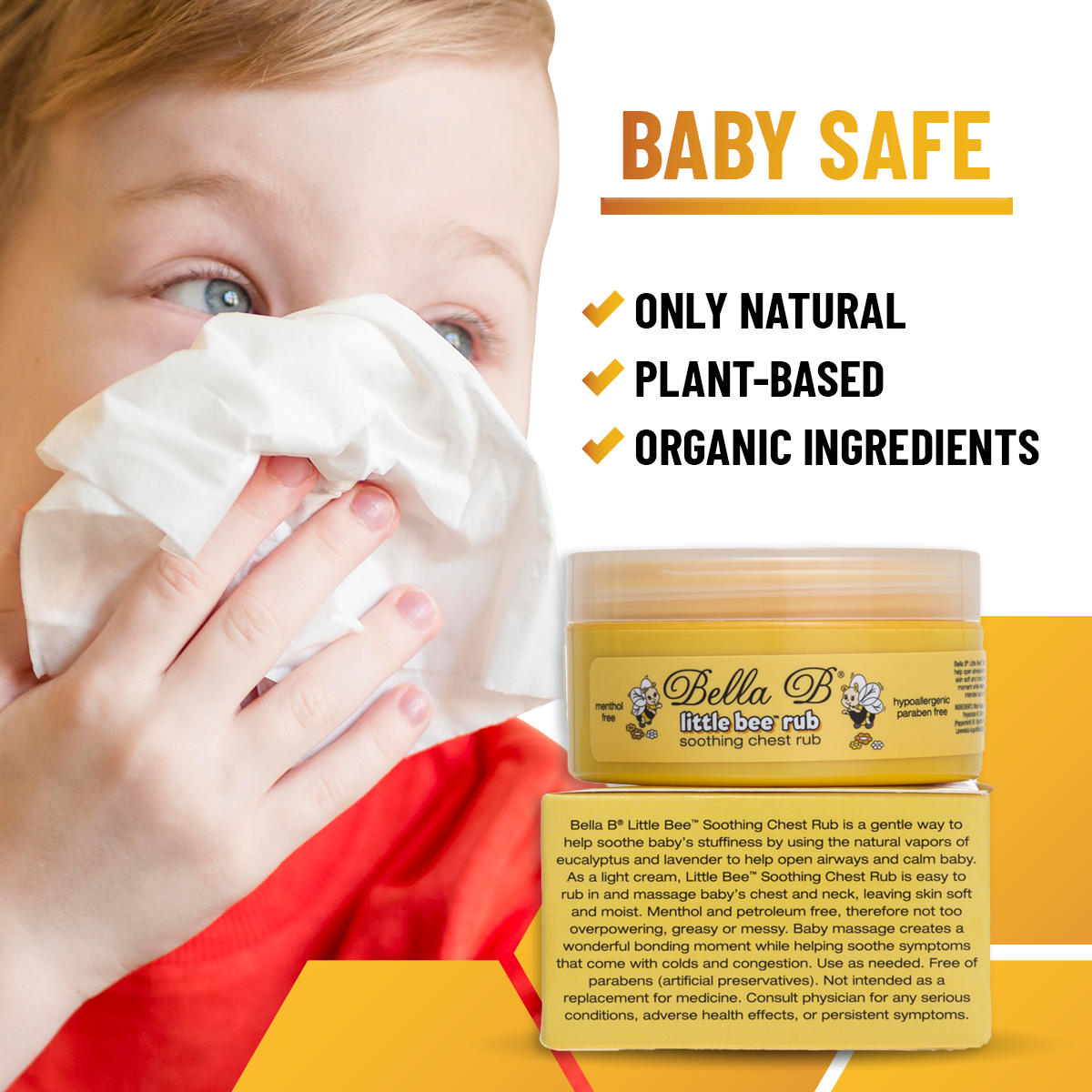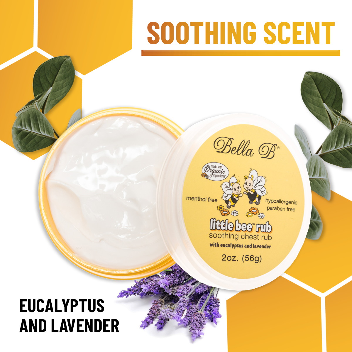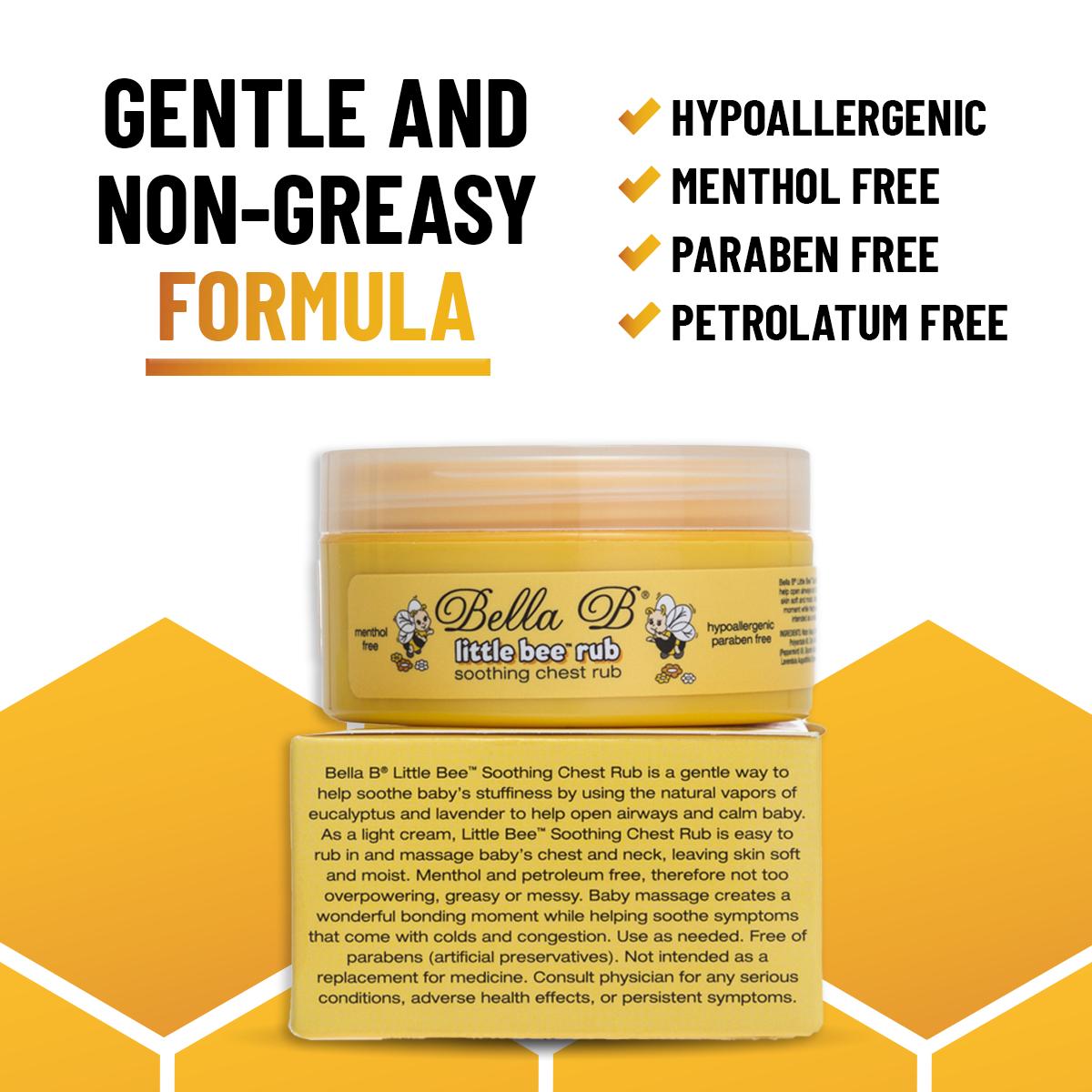 Bella B Little Bee Decongesting Chest Rub is a gentle way to help soothe baby's stuffiness by using the natural vapors of eucalyptus and lavender to help open airways and calm baby. As a light cream, Little Bee Soothing Chest Rub is easy to rub in and massage baby's chest and neck, leaving skin soft and moist. Menthol and petrolatum free, therefore not too overpowering, greasy or messy. Baby massage create a wonderful bonding moment while helping to soothe symptoms that come with colds and congestion. Hypoallergenic and free of parabens (artificial preservatives) Use as needed.