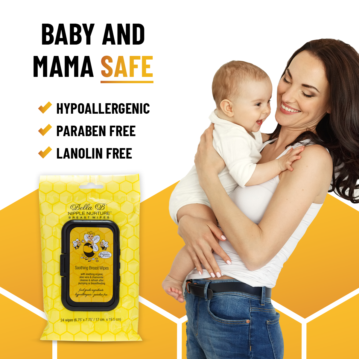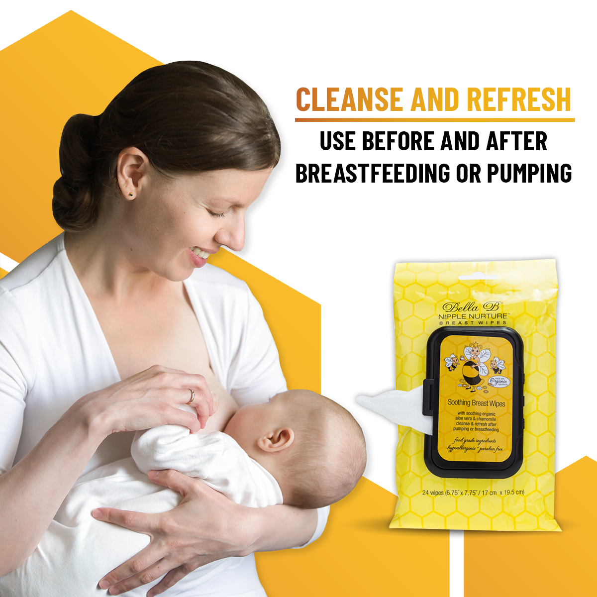 Nipple Nurture Soothing Breast Wipes are ideal for use before and after breastfeeding to soothe, cleanse and refresh. Includes organic aloe vera to help heal sore and cracked nipples. All ingredients are 100% safe for mom and baby. Free of parabens (artificial preservatives), lanolin (comes from sheep wool), petroleum or any other animal by-products. Wipe breast and nipple before and/or after pumping or breastfeeding.