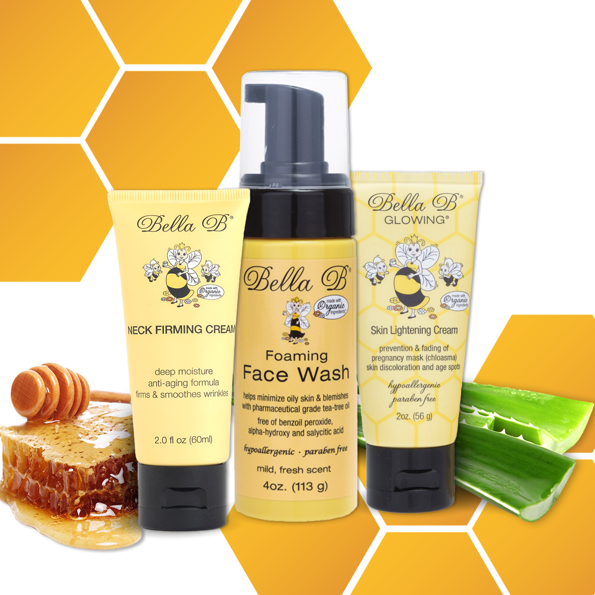 Bella B Bundle - Neck Firming Cream 2oz and Foaming Face Wash 4oz and Glowing Skin Lightener 2oz