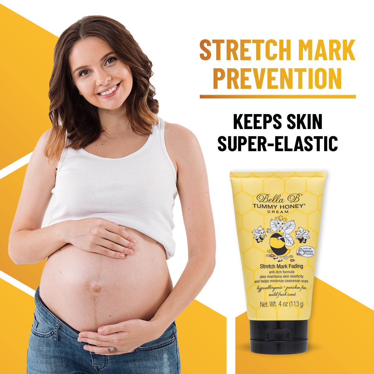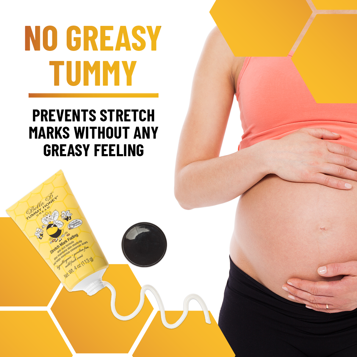 Free of petroleum, lanolin, and parabens (artificial preservatives), Tummy Honey Cream is ideal for helping to fade existing stretch marks and soothing "itchy tummies". The emulsion formula (oil and water base) soaks in to reconstruct the inner layers of skin. Tummy Honey Cream is made with key organic ingredients such as shea, aloe vera, honey, and siegesbeckia orientals, a plant extract clinically proven to help fade stretch marks. Our thick, creamy formulation also keeps the skin moist, supple and elastic for hours. Mild, fresh scent. Apply liberally twice daily. Consistency is key!