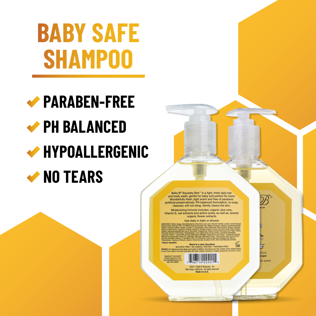 Bella B Squeaky Bee is a light, fresh daily hair and bodywash, gentle for baby and perfect for mom. Wonderfully fresh, light scent and free of parabens (artificial preservatives). PH balanced, hypoallergenic formulation, no soap cleanser, will not sting. Gently cleans the skin. Moisturizing formula includes: organic aloe vera, Vitamin E, oat extracts and amino acids as well as several organic flower extracts. Use daily in bath or shower.