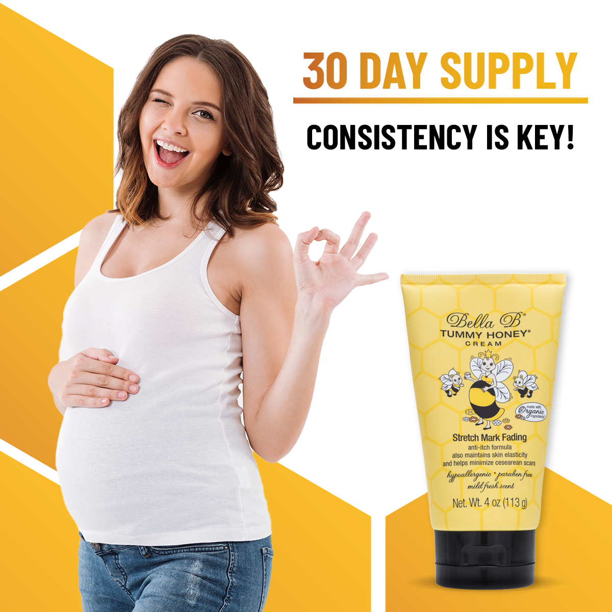 Free of petroleum, lanolin, and parabens (artificial preservatives), Tummy Honey Cream is ideal for helping to fade existing stretch marks and soothing "itchy tummies". The emulsion formula (oil and water base) soaks in to reconstruct the inner layers of skin. Tummy Honey Cream is made with key organic ingredients such as shea, aloe vera, honey, and siegesbeckia orientals, a plant extract clinically proven to help fade stretch marks. Our thick, creamy formulation also keeps the skin moist, supple and elastic for hours. Mild, fresh scent. Apply liberally twice daily. Consistency is key!